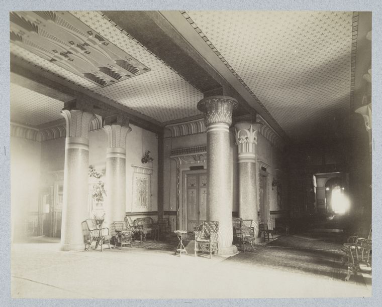 On entering, one came to the Egyptian Hall, the foyer, whose focal point was the Grand Staircase with four imposing columns – copies of the temple columns of Karnak. This foyer was the centre of much of the social life of the hotel, and much of the revelry too; the Staircase was flanked by two voluptuous caryatids – of whom more later. In an alcove of the foyer was Mansour’s Jewellers, selling gold, silver and Pharaonic tomb relics. Off to the right was the American Bar, sometimes jokingly called the Long Bar after the Long Bar at the Raffles Hotel in Singapore. Physically quite short, the “Long Bar” at Shepheard’s won the nickname because of the length of time it took to get served. At the rear of the Egyptian Hall, passing beyond the lounge seating for the overspill clientele of the bar, was the Moorish Hall or Arabic Hall, another lounge area. Off to the left were the Restaurant and, smaller, the Grill Room.
