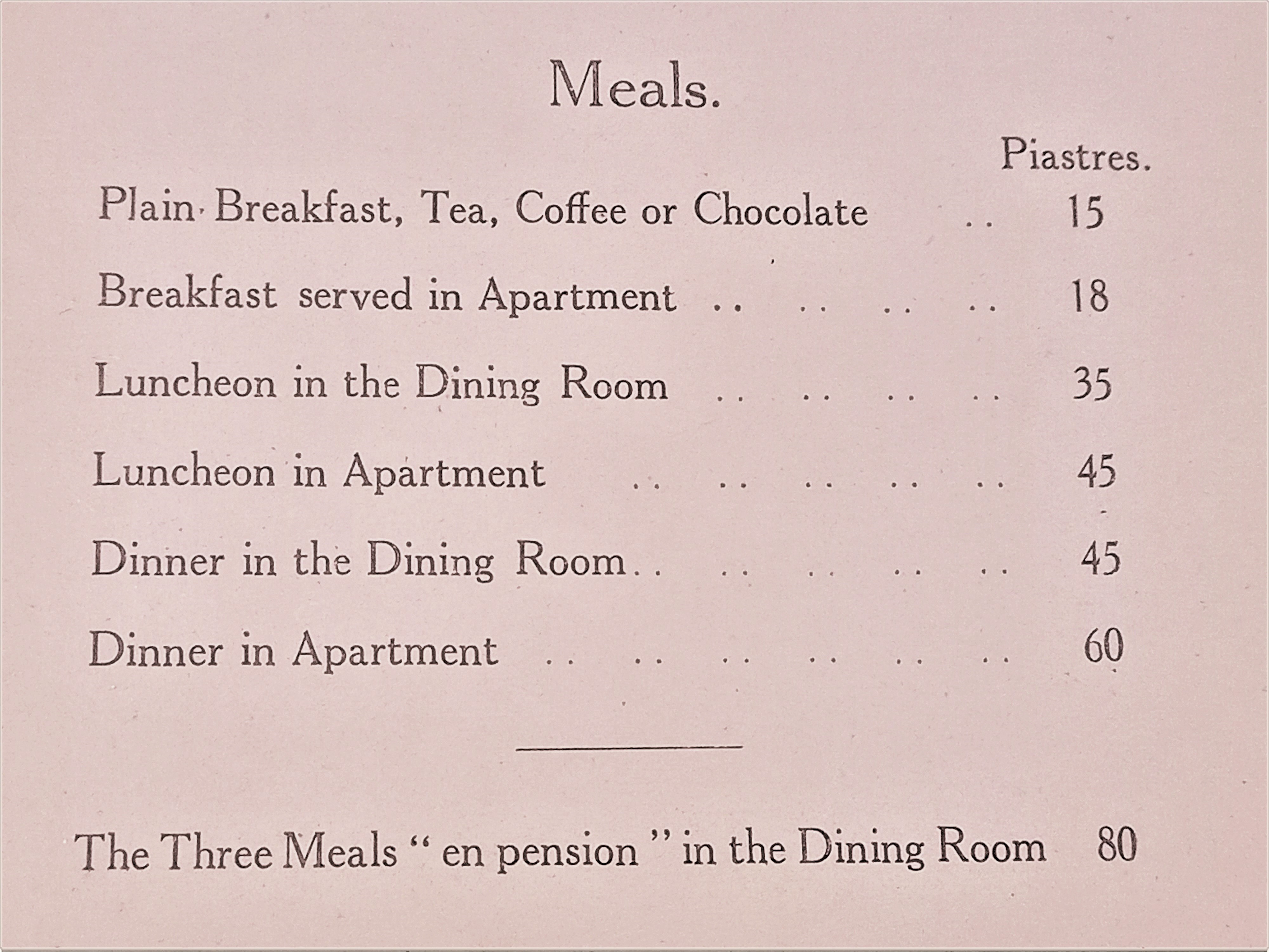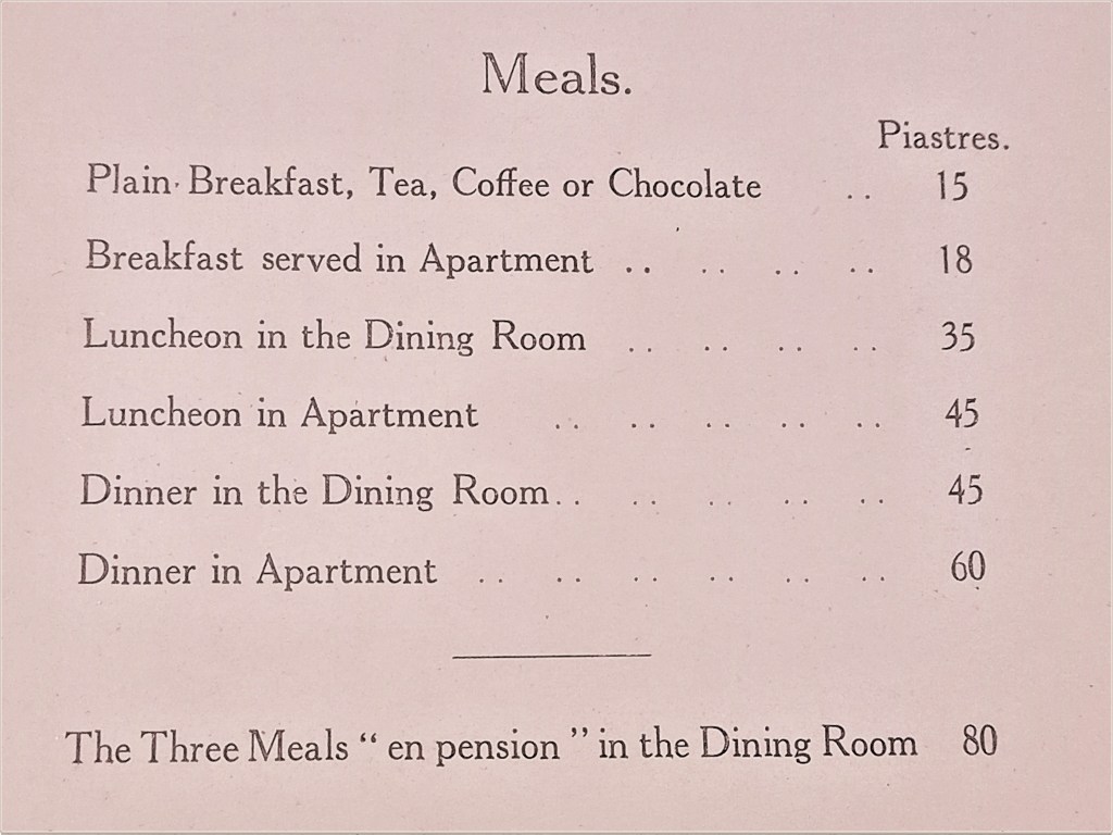 All were grandly furnished. Of course the hotel had many bedrooms. The ground floor rooms tended to be singles, favoured by younger officers (of the military, only officers were permitted to stay at Shepheard’s) who discovered that they could get in and out of the hotel through the windows, thus avoiding those sitting at the Terrace (it was important to enter the correct window, as several learned). The larger and more well-appointed rooms were upstairs, including suites.