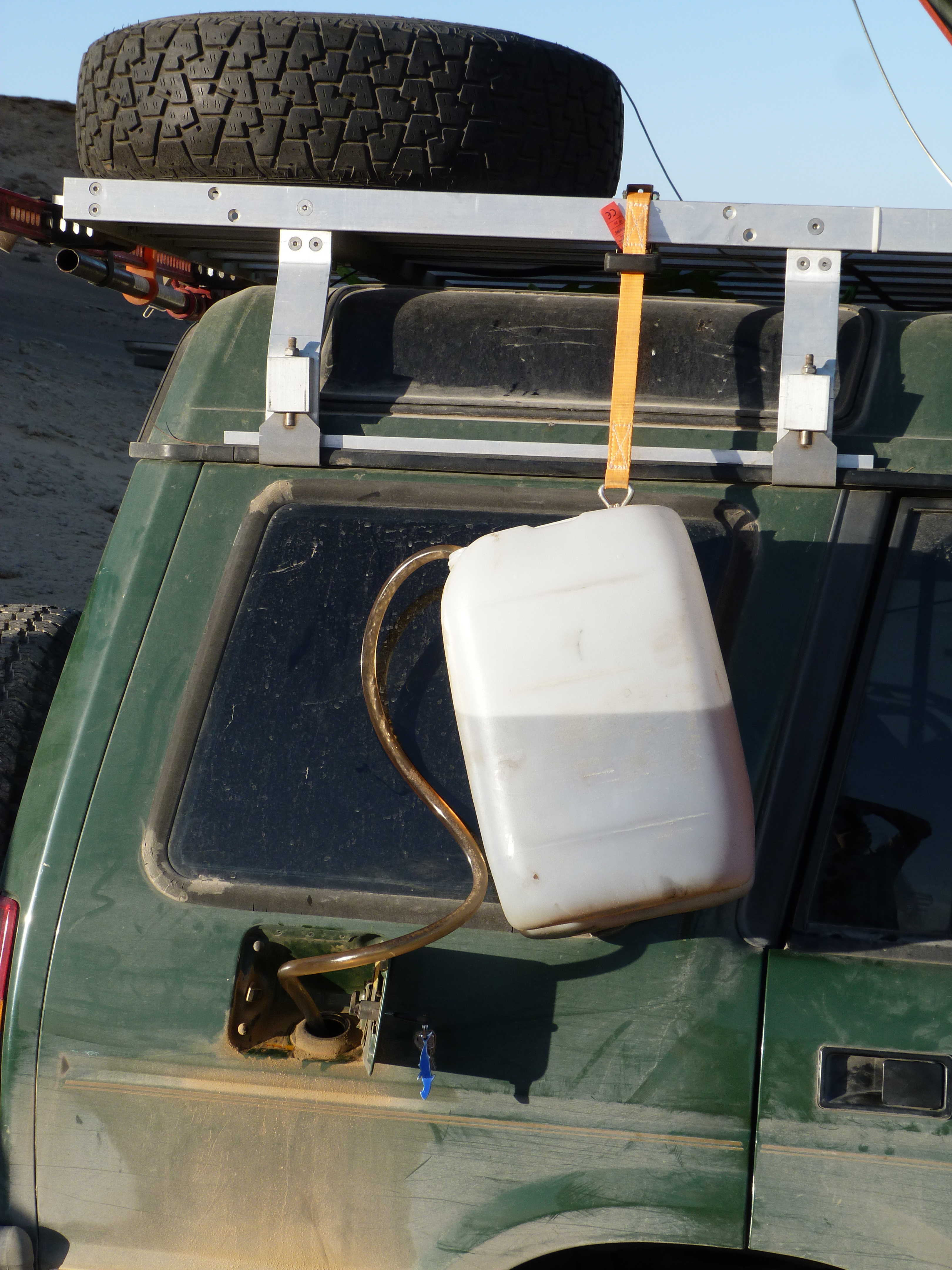 The ‘magic bullet’ for filling a car from any sort of can or external tank is the wonderful ‘jiggle syphon’, a self-priming hose syphon that will transfer up to 20 litres a minute. They are available for around £10-20 on Amazon or at any well-stocked overland equipment supplier. I got my most recent one from Black Paw 4×4 in York. You can drop the syphon in the can and let it get on with it – no tedious pouring or lifting of heavy cans.