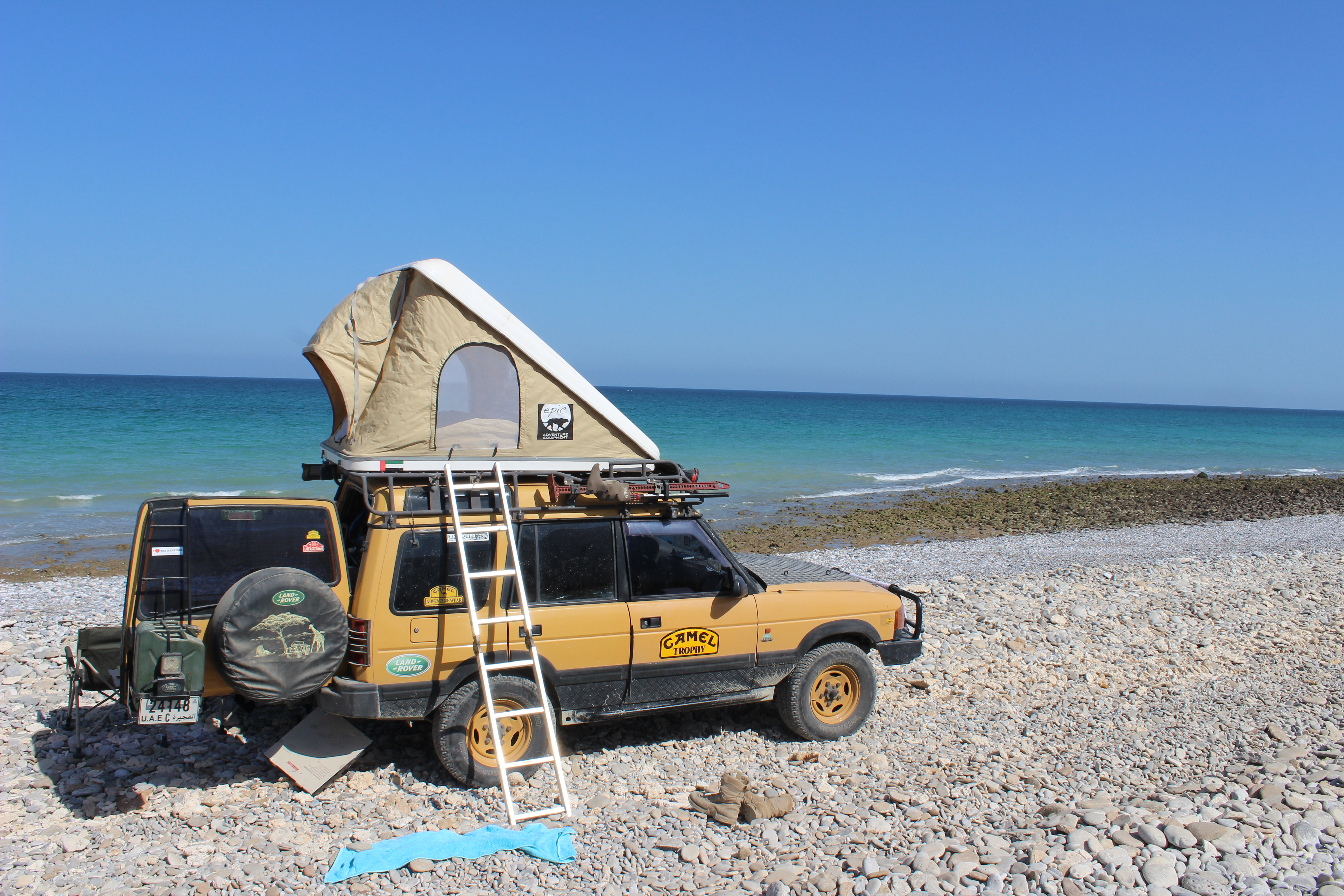 Until recently I had a ‘clamshell’-type design on my Camel Discovery here in the UAE, whereas my Defender and Discovery in the UK both have ‘soft shell’ designs that open out like a book. I’ve since replaced the clamshell on my Camel Disco with a soft shell here as well. It’s been interesting to compare the two types with their advantages and disadvantages. Seldom does a month go by without people asking me about recommended use and placement of roof tents on their Land Rovers, so it might be worth passing on the results of that comparison here.