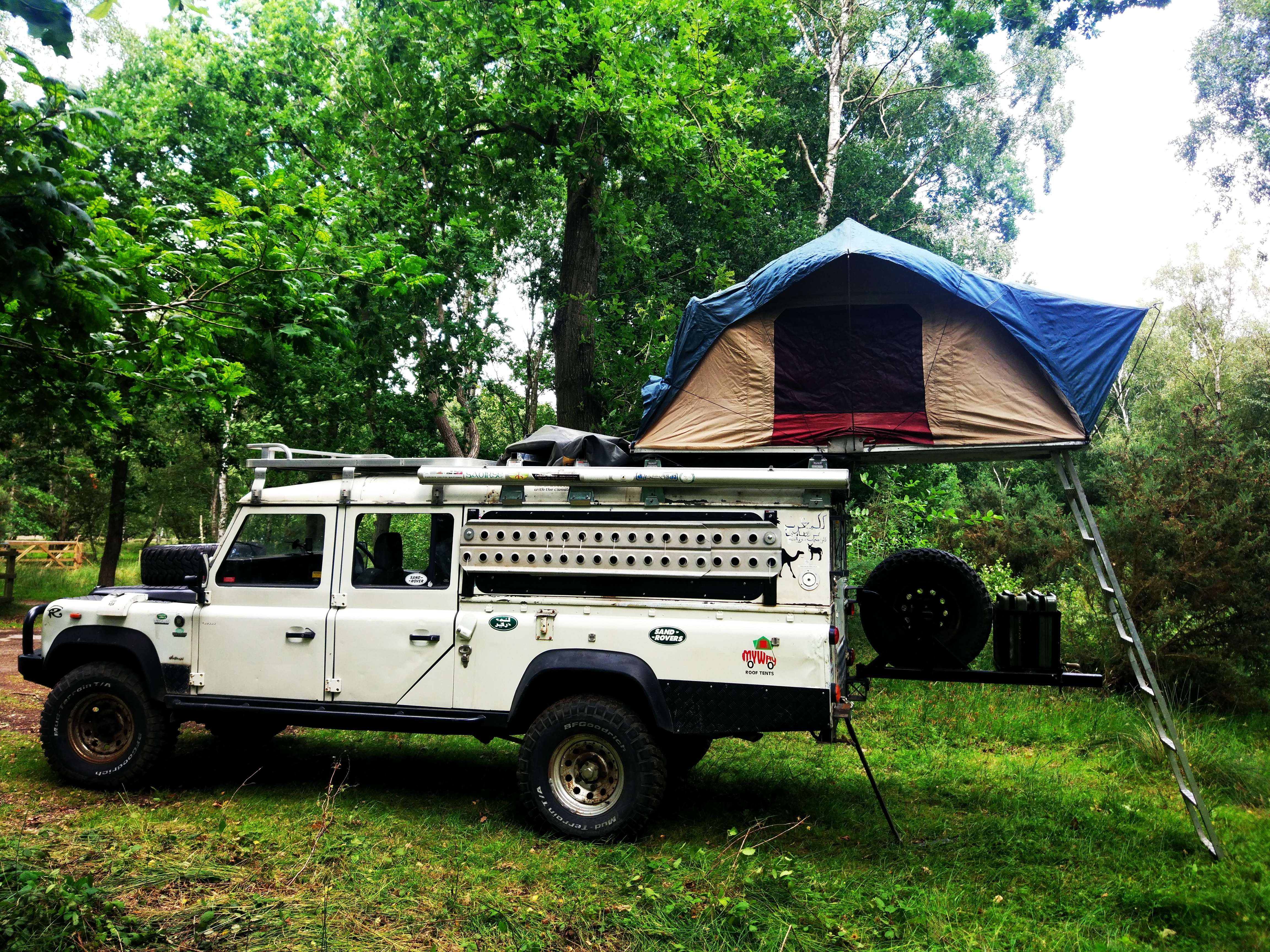 The most immediately obvious difference, apart from the design and structure of the tents, is that with the clamshell tent you give most of your car roof area to the tent floorplan. Land Rover roofs, being dependent on an aluminium structure, often have quite low maximum loads, so a lot of folk don’t use them for loadbearing. In that case, no loss – the roof is for the tent, and that’s fine. However other users prefer to keep light, bulky equipment on the roof, like clothing, bedding or solar panels – for them the roof space is important, so the fold-out nature of the soft-shell tent is an advantage because it only takes up a half the roof space. In addition, the folded-out half of the tent, supported by a ladder, can give a shelter over the side or the rear of the vehicle. In either case if you choose the tent wisely you don’t need a full roof rack – roof bars will support the weight.