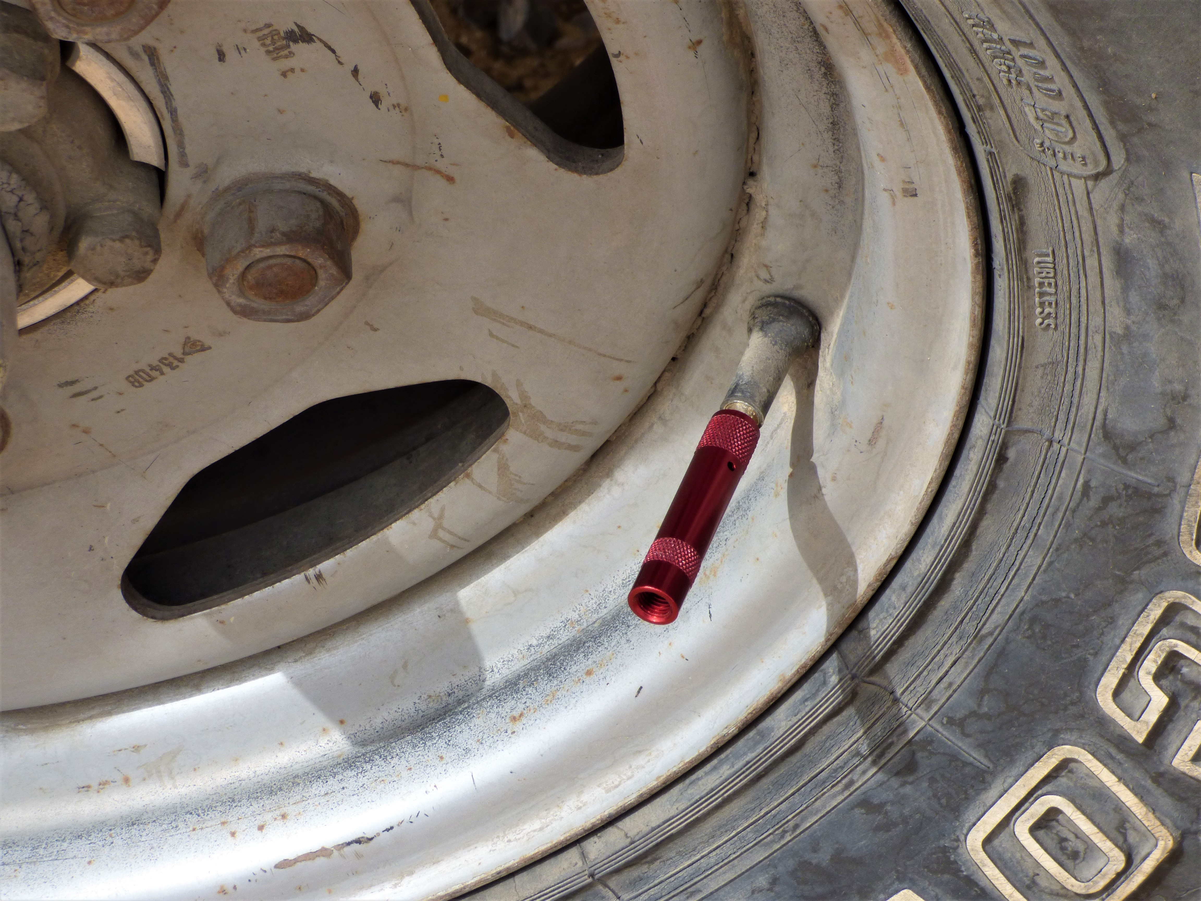 Standard procedure here is to air down the tyres. Three of the wagons were running big Cooper Discoverer 285s, for flotation in the sand that is often too soft to walk upon, all at about 38psi. However for desert use we aired down to about 18psi, generally using Staun deflaters for the job. However I was trying out a set of Trailhead deflaters on this trip and they too seemed very good. I’ve found that after a while the brass of the Stauns gets worn and a bit loose so it’s good to explore alternatives.