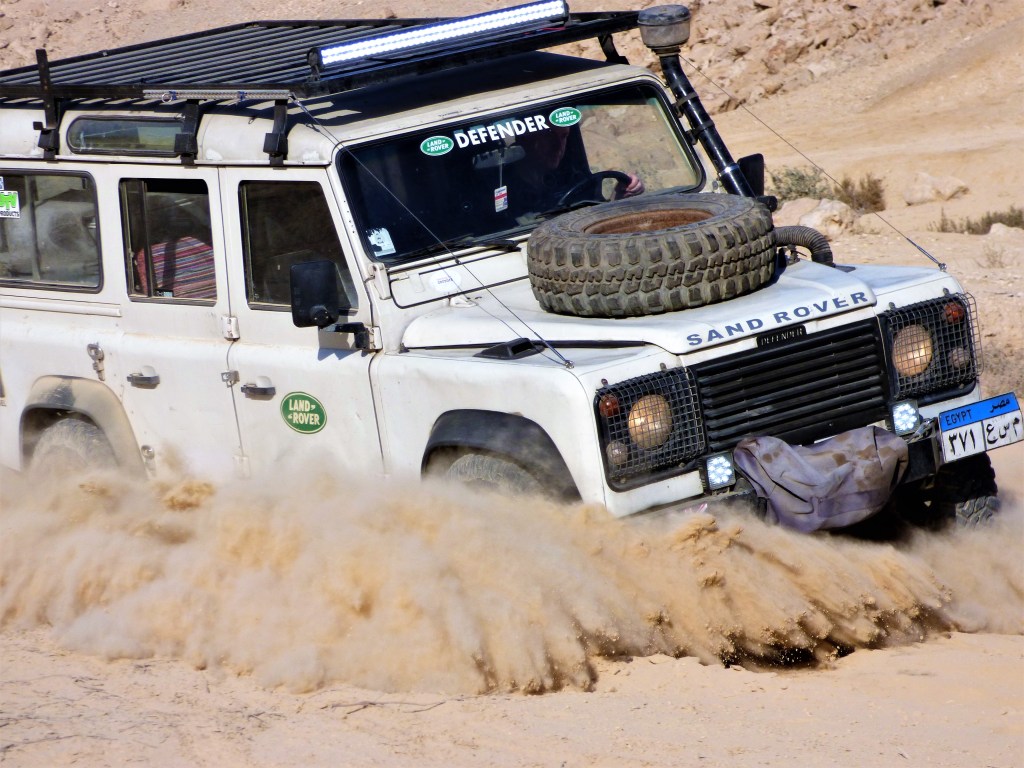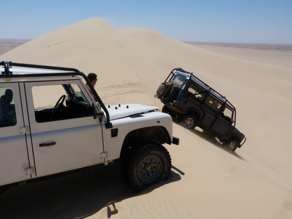 Perhaps our response was not as they would have liked. Three of the Defenders bomb-bursted around the obstacle, whilst one charged straight at it, battering over and through it with three tons of angry Land Rover. We heard shots, which flew wild, and the four trucks roared away into the desert unscathed. Accurate range of a 9mm pistol is around 20m so we were very quickly out of danger, and we pauseed a mile or so further on to take stock. Nobody hit, and no Land Rovers with bullet holes. Who were they? No idea. Miners who haven’t been paid for months? ISIS fundamentalists? Common bandits? Who knows. The conversation carried on by radio as we drove back to Cairo. Just another piece of the rich tapestry that is modern-day deep desert travel in the Sahara…..