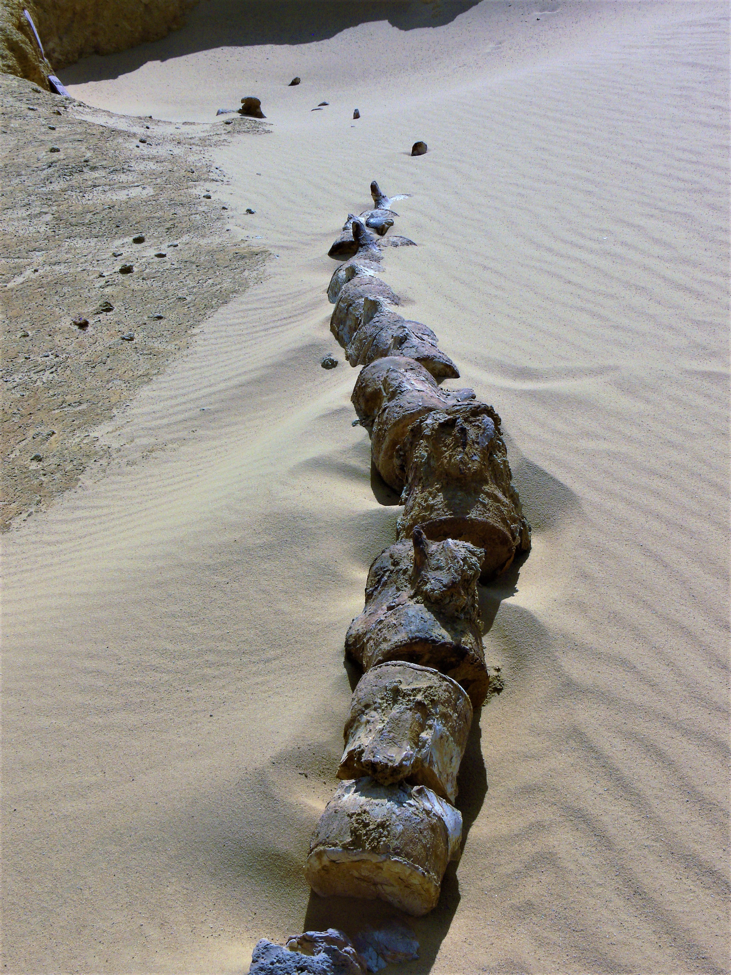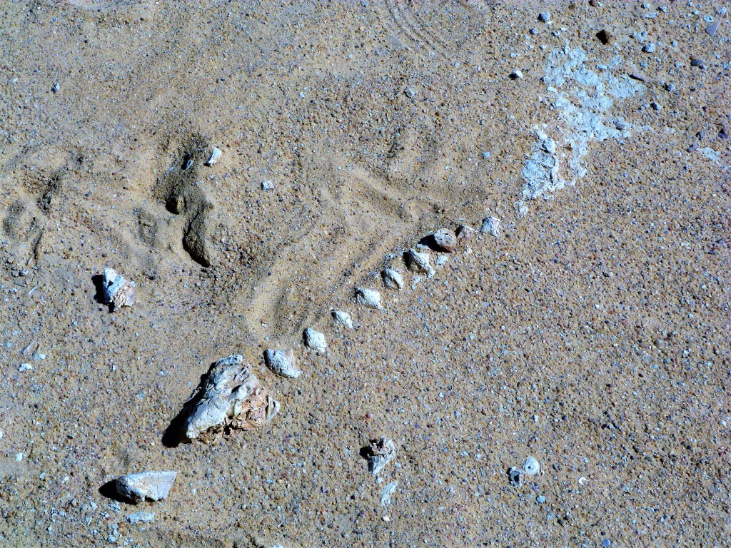 We circled round the site and then parked up away from the fossils themselves. It was then that Canadian friend Darrell noticed strange ring-shapes in the sand not far off to the left. Looking more closely we spied lines of rocks, some with ropes round them, and fragments of old canvas. Amazing – the site of the original expedition in their bell tents? Maybe. On to the fossils. The dessicating sun and wind have destroyed many of them at ground level but with care it’s still possible to see the fossilised bones of these, some of the ancestors of humanity. They were vast – huge shoulder blades and spinal columns jutting from the sand over a large area. Having done our research before the trip we knew what these were – Arsinoitherium – a giant mammal that lived here 36 million years ago. Twin-horned, 6 feet at the shoulder, these were big animals. Mike, another of the gang, found a partial skull, but when we tried to unearth it, it crumbled away. We paused to look around. There were a lot of the fossilised beasts concentrated in this small area, flanked and surrounded by the fossil trees. Was this a swamp where they all got stuck and drowned, amidst the trees? Who can tell. We carefully excavated some of the larger bones and wrapped them in bubblewrap to take back to Cairo.